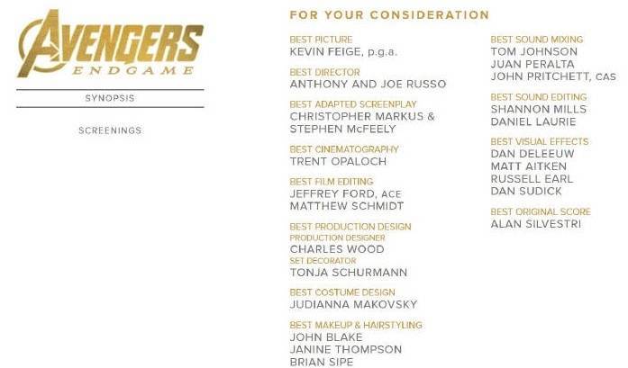 迪士尼曝光了《复仇者联盟4:终局之战》冲击奥斯卡的具体报名奖项,将参与包括最佳影片、最佳导演、最佳改编剧本、最佳摄影在内的12个奖项的竞争,全部为导演、编剧、技术类奖项。