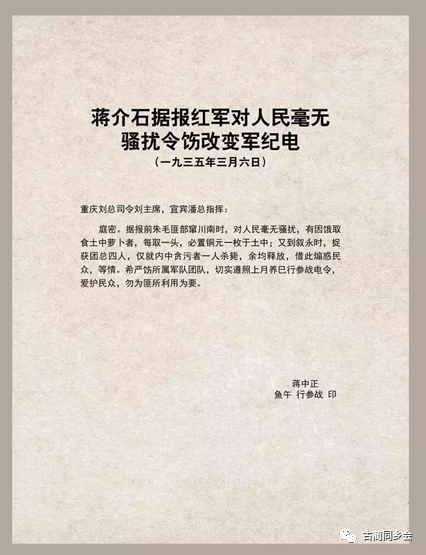 同日,蒋介石致电刘湘、潘文华:“据报前朱毛匪部窜川南时,对人民毫无骚扰,有因饿取食土中萝卜者,每取一头,必置铜元一枚于土中;又到叙永时,捉获团总四人,仅就内中贪污者一人杀毙,余均释放” 。希严饬所属军队团队,爱护民众。