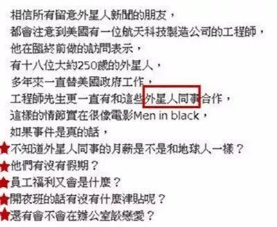 他不仅相信外星人的存在,还深入探讨外星人的外貌特征,以及关心一些奇奇怪怪的问题。如“外星人的工作月薪是否和地球人一样”、“外星人会不会开展办公室恋情”等等。