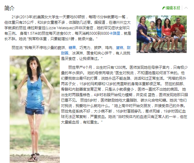她的名字叫做丽兹·维拉斯奎兹,是美国人,她的身高1米57,体重却只有27公斤,仅相当于一个8岁女童的重量,刚开始的时候有很多人都猜测她是不是得了厌食症,吃不进去饭呢?恰恰相反,她一天要吃60顿饭,每隔15分钟就要吃一次。