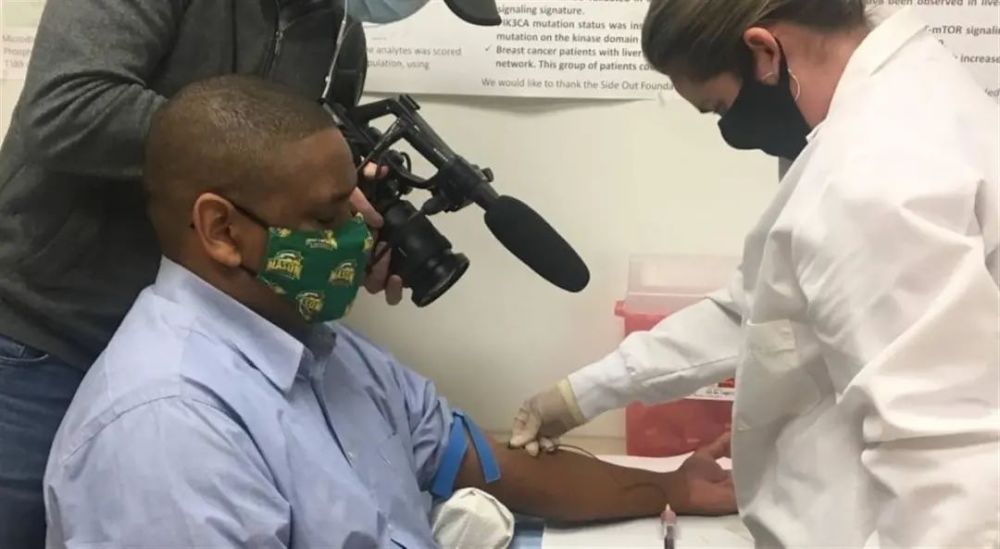 2021年3月,霍利斯在乔治·梅森大学校园里抽血(图源:受访者供图)