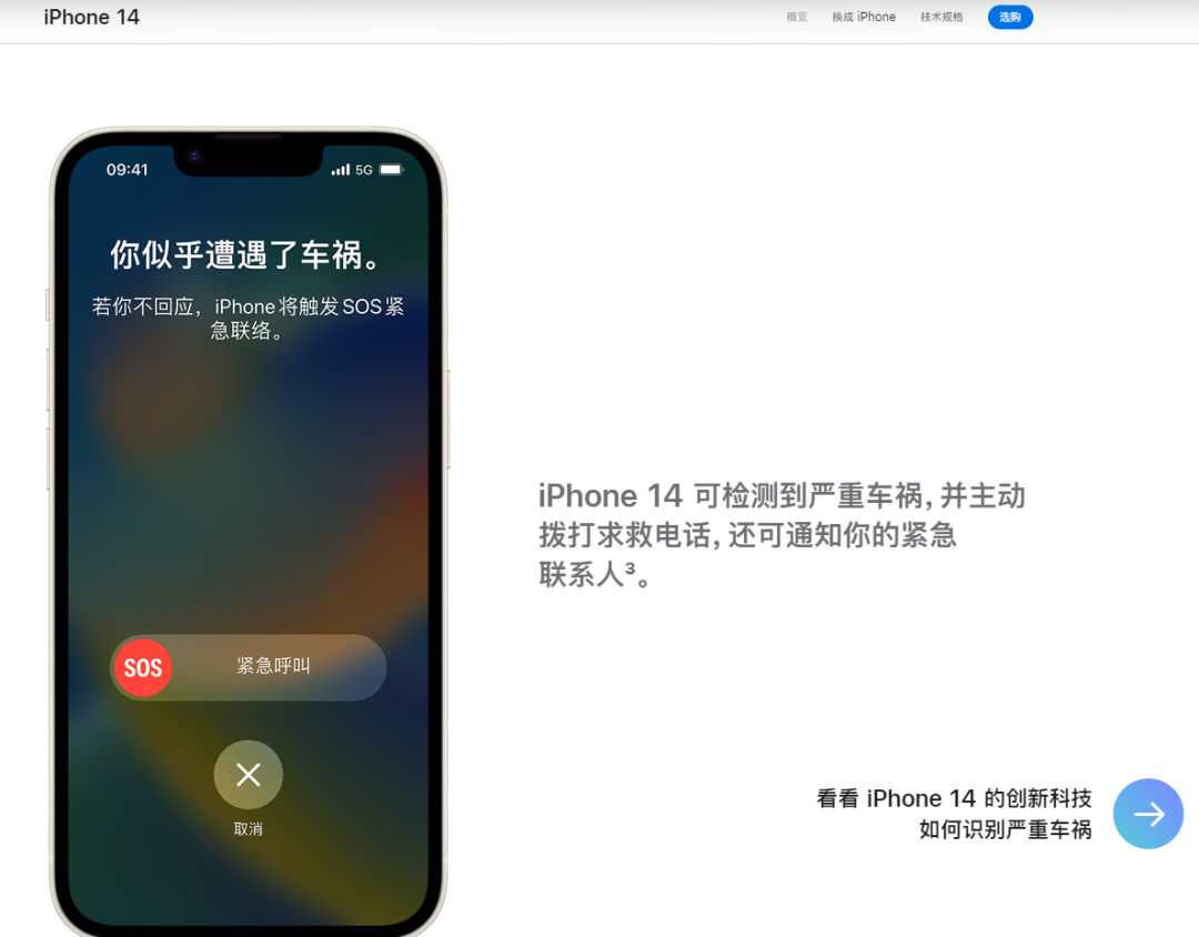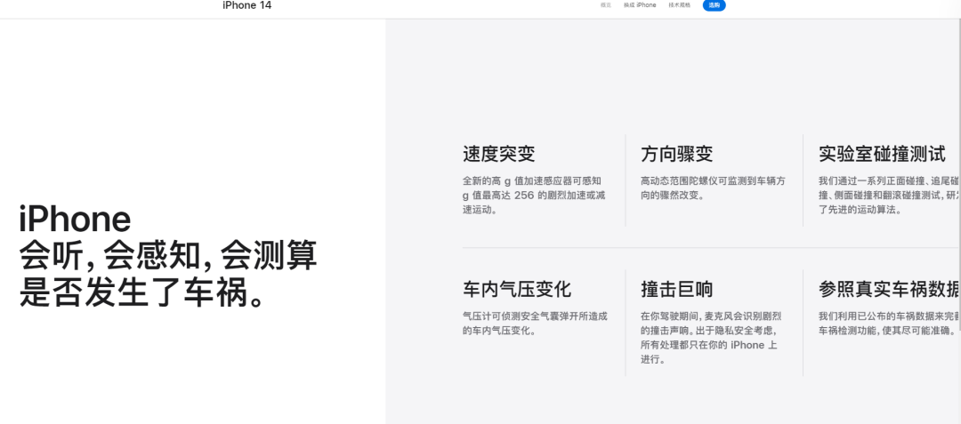这个功能14全系标配,根据苹果的说法,它运用到了一些列的传感器,高 g 值加速感应器感知速度突变,高动态范围陀螺仪可监测到车辆方向骤变,气压计可侦测安全气囊弹开所造成的车内气压变化,麦克风会识别剧烈的撞击声响。