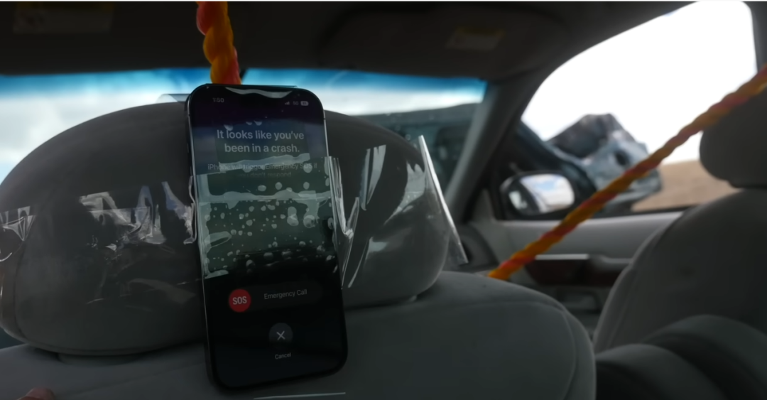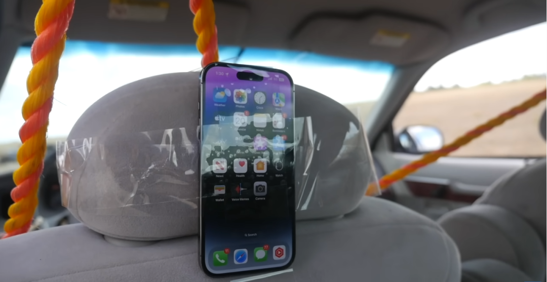 他们将一部新的 iPhone 被绑在 2005 年水星大侯爵轿车的座椅头枕上,并由遥控器控制。这辆车随后撞上了一堆失事的车辆,模拟一场严重的车祸。