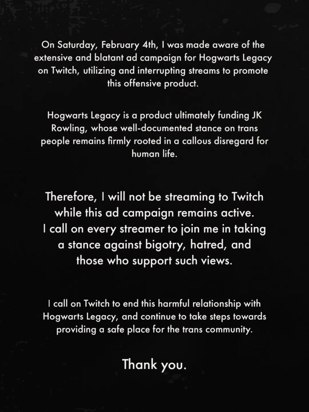 Twitch 播主 Nikatine 2 月 6 日在其社交账号上发布了一篇抵制声明,呼吁广大玩家不要购买、游玩甚至是观看此游戏。“《霍格沃茨之遗》这款游戏最终会让 J·K·罗琳获得收益,我本人不会直播这个游戏,并希望Twitch官方终止对游戏的宣传,为社区提供一个安全的环境。”