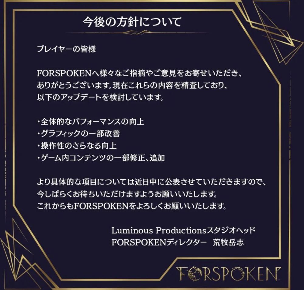 SE 夜光组开发的 ARPG《魔咒之地(Forspoken)》公布游戏总监「荒木岳志」留言,他表示已经收到玩家对游戏的反馈与建议,未来将在提升游戏整体表现、改善画质、提升操作性和修改追加游戏内容等方面改善游戏,详情将在近期公布。