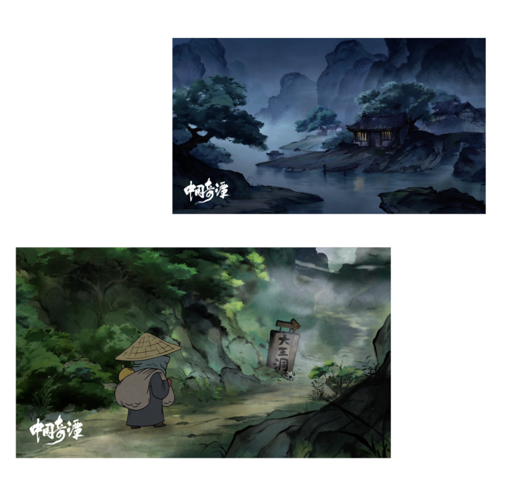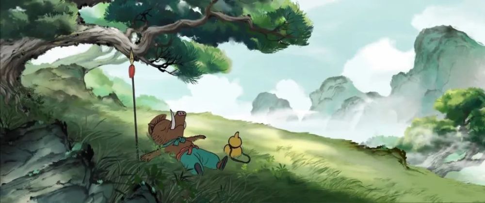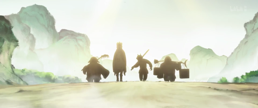 背景中水墨画融合光影的美术风格,精良考究,猪、狼、熊、鸟等妖怪化神话为具体定像,形象生动,颇为风趣。而师徒四人在片中从未露脸,但不妨在《西游记》文化感染下成长起来的一代观众去想象,以剪影搭配适合的光效,从而使小妖怪内心对大人物的仰望与崇拜更加立体。