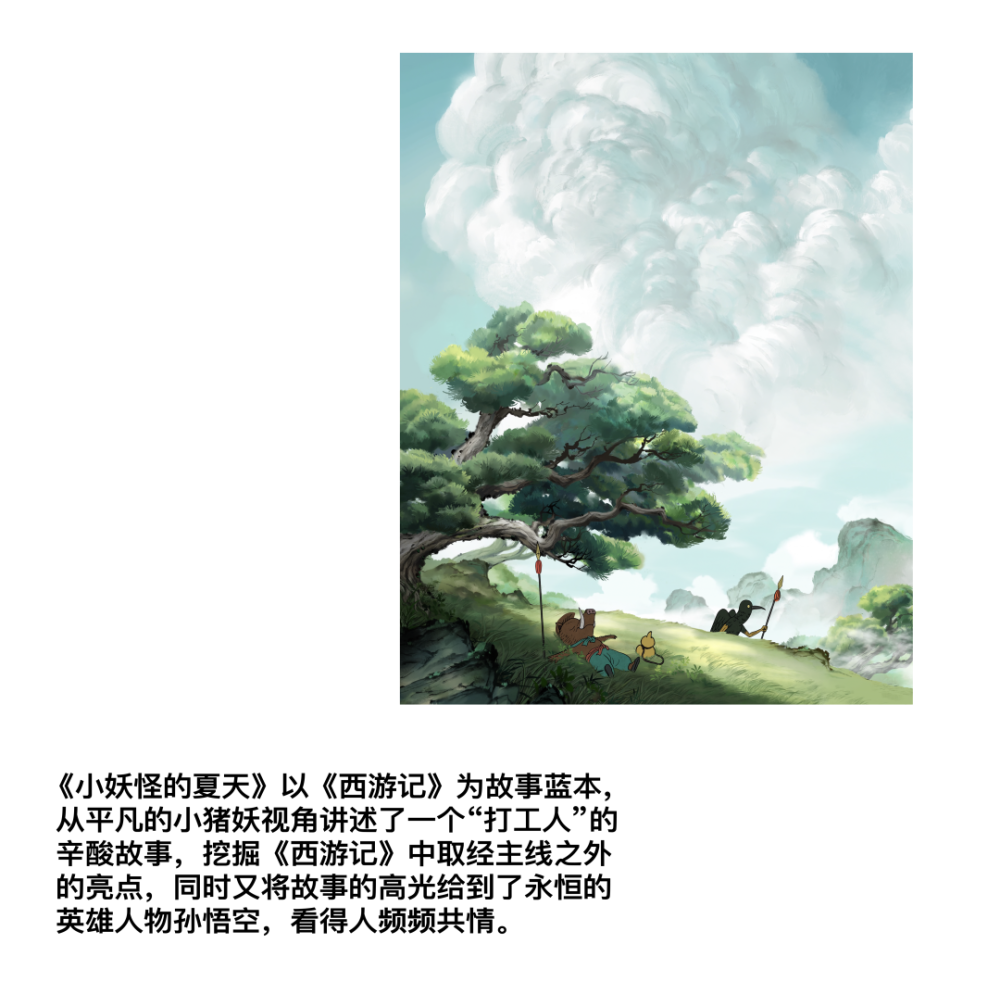 《小妖怪的夏天》以名著《西游记》为内核取材,出人意料的是,它并不再以唐僧师徒四人为主视角,也不将九九八十一难历险路中有名有姓的大妖怪作为主角,而是以“社畜小猪妖”为切入点,这是一个发生在浪浪山的妖怪职场故事,颇有黑色幽默的喜剧意味。