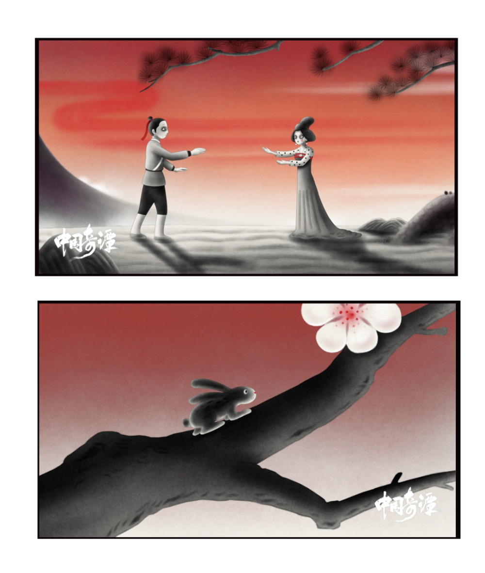 中式美学也在其中展露无遗,《鹅鹅鹅》充满了水墨和戏曲元素,每一帧都是手绘上色,中国古代传统审美与素描式画法打下基底,并进行了美学技术上的嫁接。货郎两黑眼圈在视觉上尤为凸显,这也是哥特式美学的典型代表,丰富了人物的性格外观,“郁”贯穿货郎人生,也为其后他在情感选择上的犹豫多了一层形象理解。帧帧似画,却又颇具中式恐怖风格,让观众戏称为成年阴影。