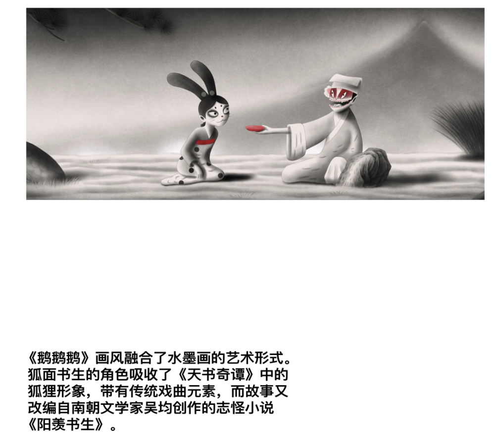 该短片改编自南朝志怪小说《阳羡书生》,与传统故事不同的是,短片在最后一处做了创新尝试,不再使背鹅笼的货郎从始至终处于旁观角度,而是拉其入事,让最后出场的女子与货郎产生新的嵌套抉择。“她求你带她去山外,她要变成一只鹅,住在鹅笼中。你又有鹅了”。