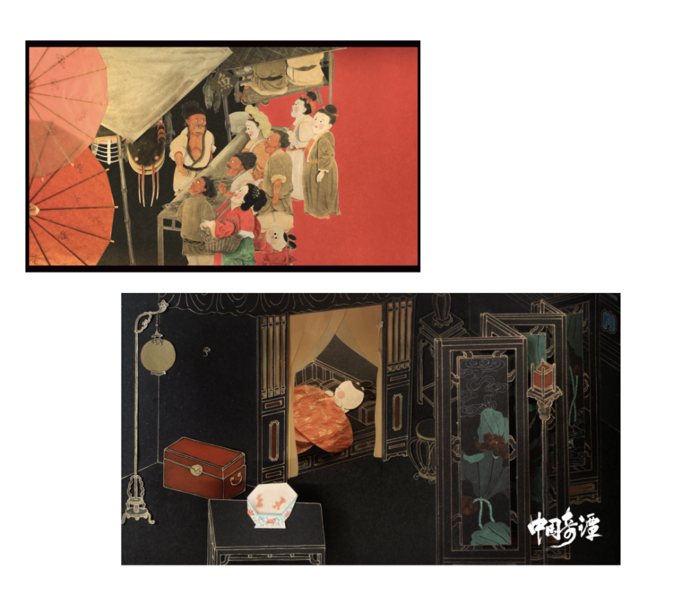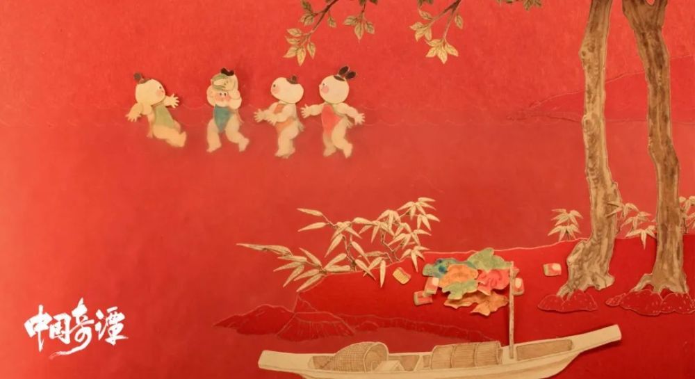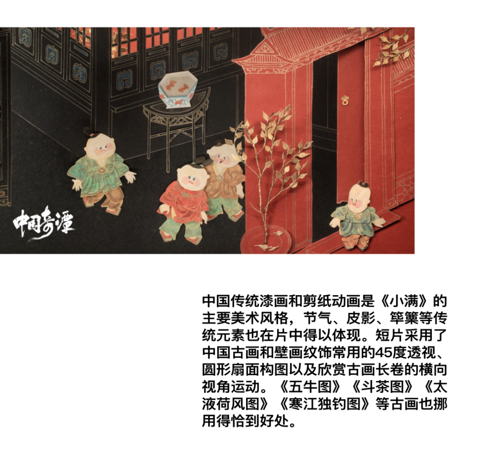 第五集的《小满》一经播出就让人眼前一亮,以红色为主的中国传统手工剪纸技术运用于片中。道具参考宋明时期的物件特征,《五牛图》《斗茶图》《太液荷风图》《寒江独钓图》等古画挪用得恰到好处,时代还原感浓厚,红色的漆画质感和逆光效果更突显精神世界的层次内化。