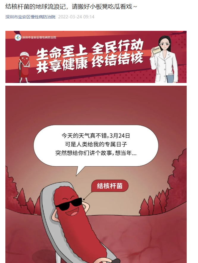 作品简介:2022年3月24日是第27个世界防治结核病日,今年的宣传主题旨在呼吁大家生命至上、全民行动、共享健康、终结结核,我们主编的漫画《结核杆菌的地球流浪记》,从结核杆菌的历史、结核病的传播途径、临床症状以及潜伏感染的风险及管理等方面深入地宣传国家结核病防治政策和结核病的防治知识,动员全社会参与和关注结核病防治工作,提高结核病人发现率和治愈率,为结核病防治事业奉献更大的力量。本次漫画登上深圳卫健委公众号(深小卫),阅读量突破10万+,起到了很好的宣传效果。