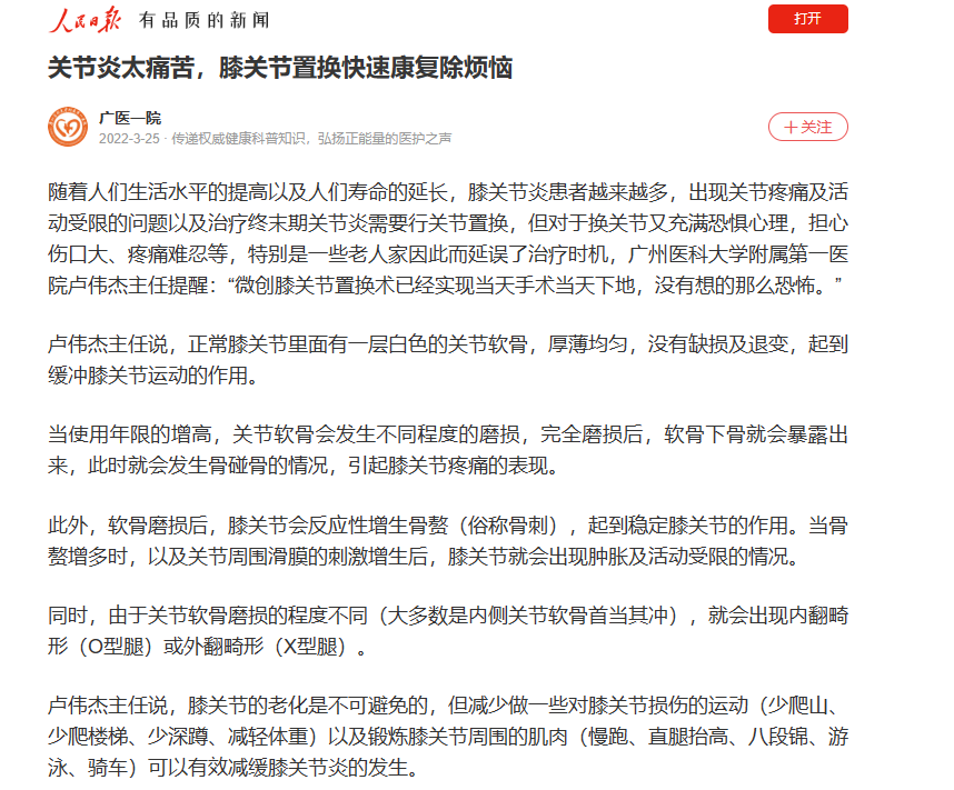 作品简介:随着人们生活水平的提高以及人们寿命的延长,膝关节炎患者越来越多,出现关节疼痛及活动受限的问题以及治疗终末期关节炎需要行关节置换,但对于换关节又充满恐惧心理,担心伤口大、疼痛难忍等,特别是一些老人家因此而延误了治疗时机,本文旨在通过权威专家讲述真实病例的诊疗故事,通俗易懂地介绍“关节炎”这类常见疾病进行科普知识,提醒广大民众:微创膝关节置换术已经实现当天手术当天下地,没有想的那么恐怖。
