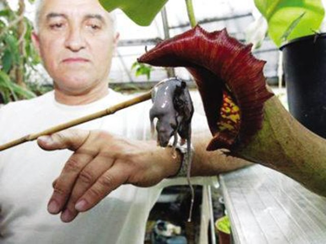 是不是很神奇呢?毕竟大多数的食物链都是从动物指向植物,仿佛植物处于弱势,而猪笼草却利用自己的天生优势制造了陷阱,吸引昆虫化为食物,真是智慧的自然捕手啊,然而更神奇的是,马来王猪笼草不仅可以吸引捕食昆虫,还可以吞下老鼠这样的哺乳动物,马来王猪笼草的捕虫袋体型更大,黏液分解力更强,是猪笼草中的捕食王者。