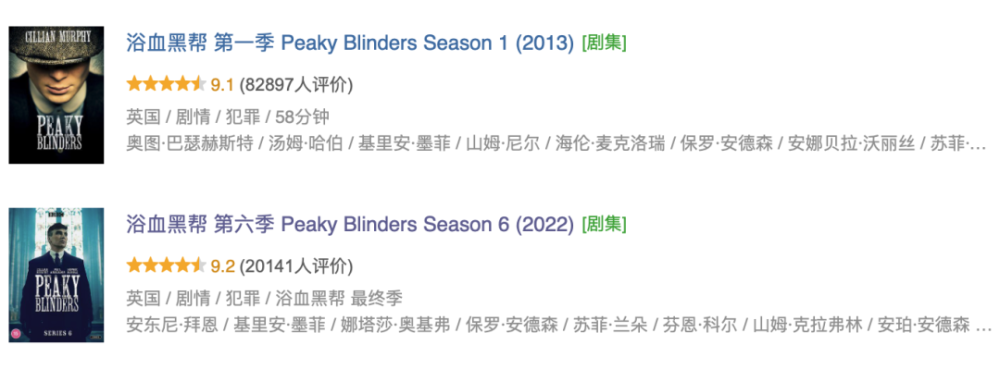《浴血黑帮》不管在国内国外都是一部口碑爆炸的剧,豆瓣上最低一季是9.1分,IMDb则是54万人标记的8.8分。