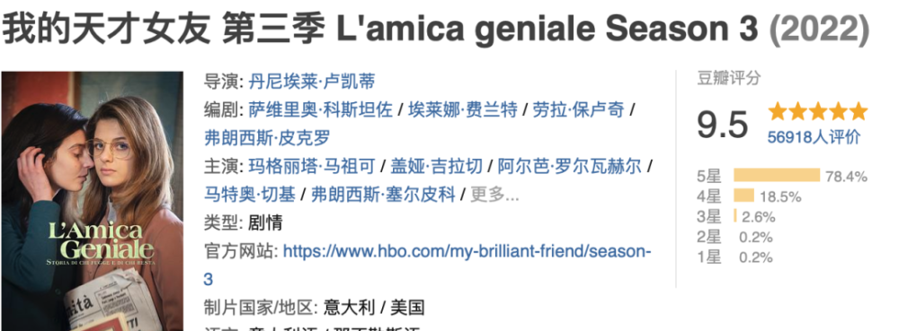 《我的天才女友》系列已经确定会拍四季,两位女主的命运将纠缠一生,超过50年。