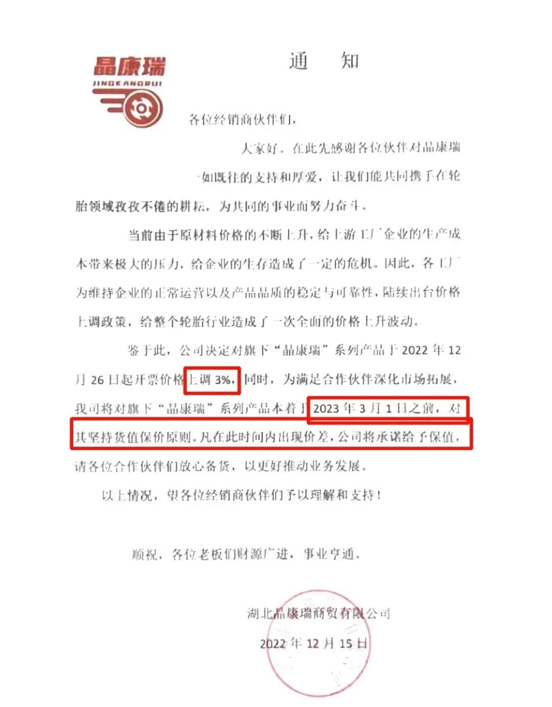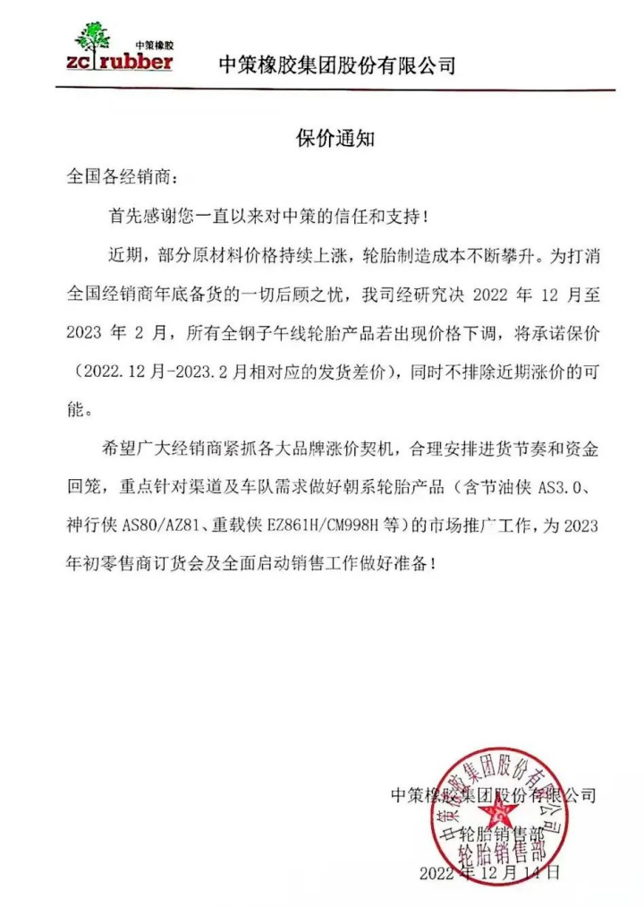 近日,山东鼎创轮胎也发布了涨价通知,宣布自2月1日起对该公司所有产品价格上调3%