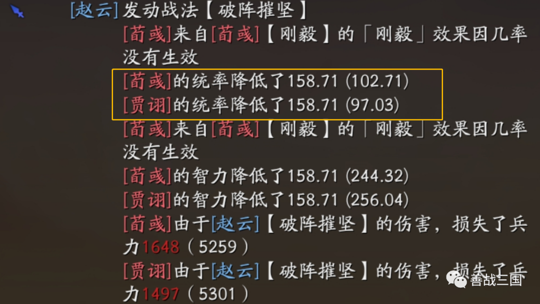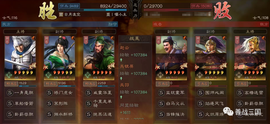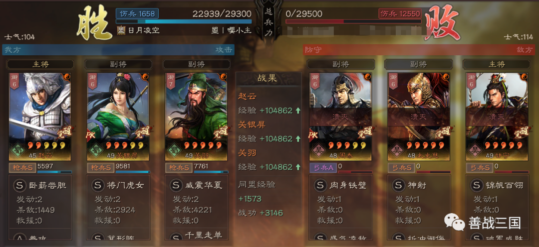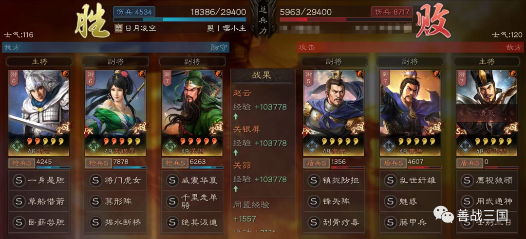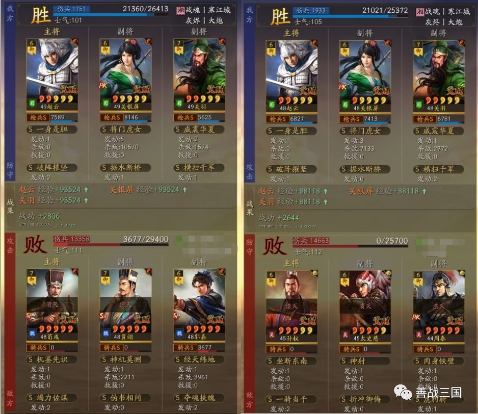 实战心得:赵云版的父女枪也还是看关羽发挥决胜负,威震华夏如果发动晚了会拖回和导致战损高,为了求稳,战法搭配优先选有伤害的补,感觉到伤害没问题了再改辅助战法追求多穿