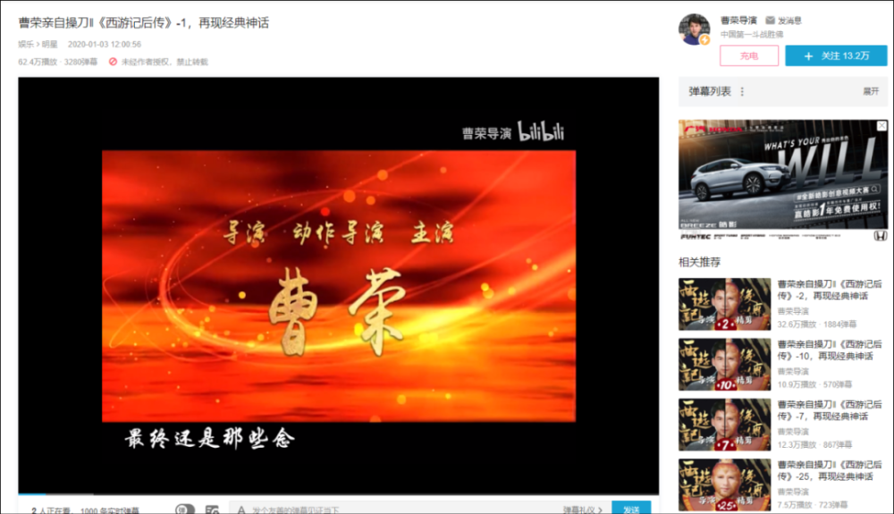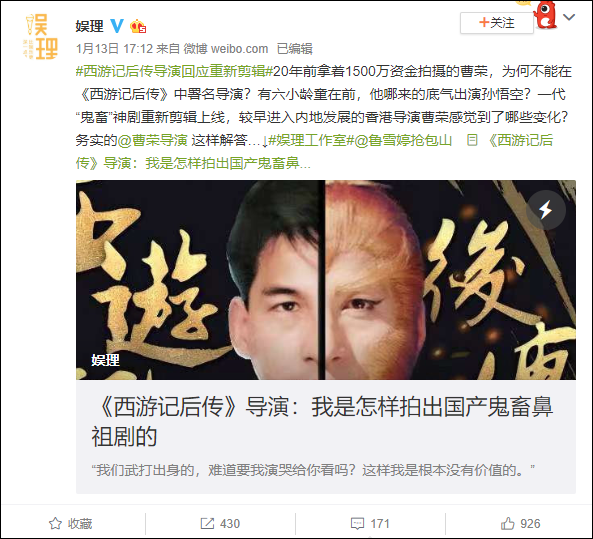 今年年初的时候,曹荣为了宣传新电影入驻B站,并宣布将重新剪辑《西游记后传》,去掉当年的鬼畜镜头。