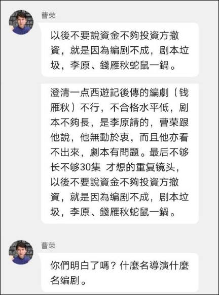 等于说曹荣把这部剧里的失误,包括鬼畜武打等全部一股脑甩给了编剧,说剧本长度太短不够30集,所以只能用重复剪辑凑时长。