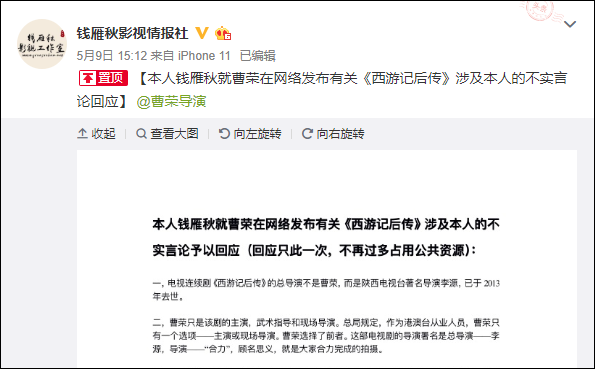 钱雁秋面对曹荣的指摘,在微博上写了一篇长长的檄文,批驳曹荣所说与事实不符。