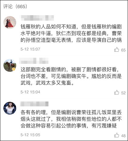 有人觉得曹荣对这部作品可以说是“鞠躬尽瘁”,替导演编剧擦了屁股,实在辛苦;也有人认为钱雁秋当年的剧本水平还是不错的,曹荣说他水平不行实在是令人匪夷所思。