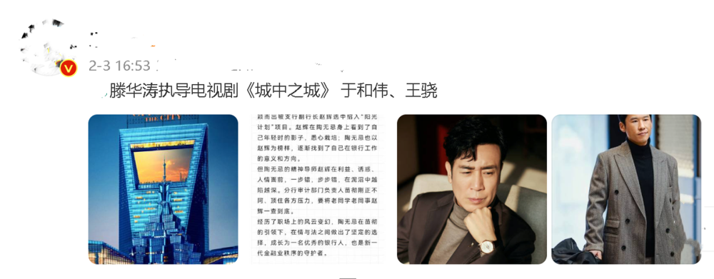 无独有偶,接下来,于和伟又有一部央视大剧要来了,该剧叫《城中之城》。早在今年央视公布2023年片单之际,该剧就赫然在列,备受关注。