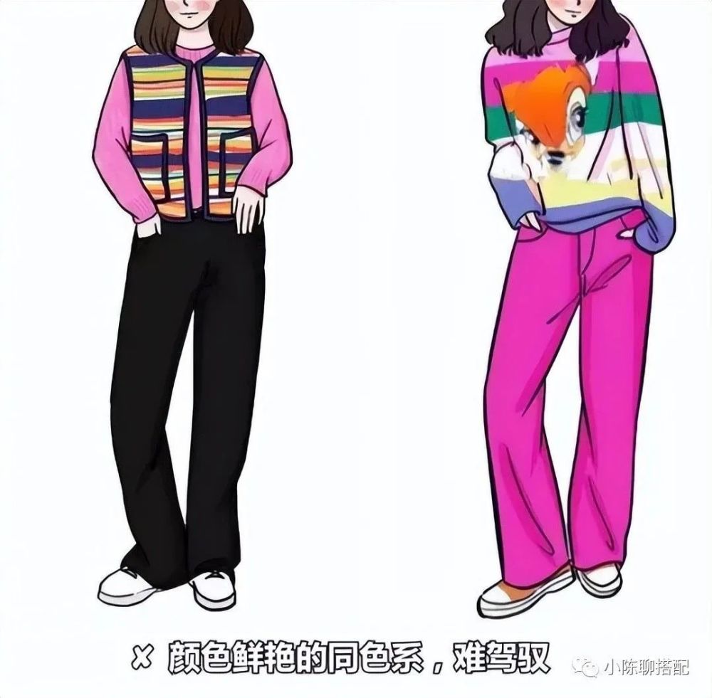 颜色鲜艳的繁杂服装如果繁杂服装或同色系服装,穿着夸张且没有重点,还很容易让人看上去显得浮夸,大部分人穿出的效果可能就是这样的: