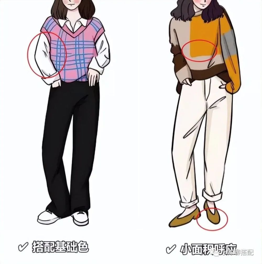 日常在穿着颜色繁杂的服装时,我们需要注意利用基础色或是小面积的呼应才是比较好的选择,整体搭配看上去不会显得杂乱,而且还会突出服装的美感: