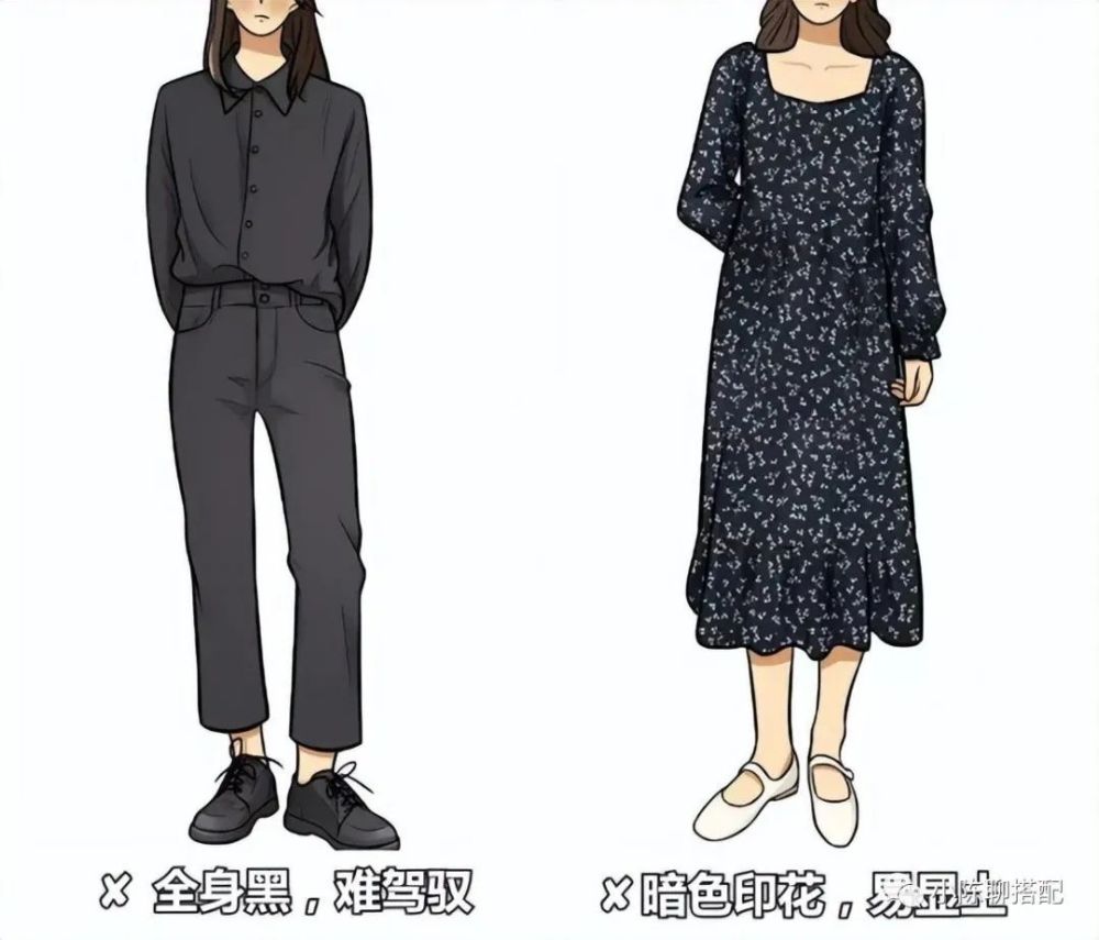 除此之外,像那种比较细密的暗色印花,非常容易显得沉闷,衬托的肤色也暗,直接显老10岁!