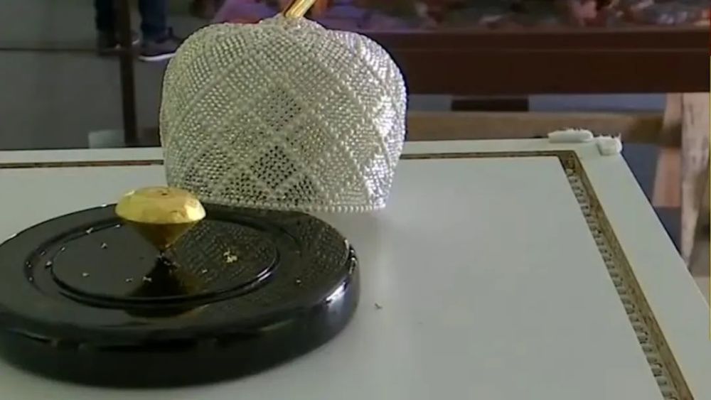 估计这个罩子都占到这个巧克力一半的钱,巧克力的外表是一层厚厚的食用金箔,塑造成了钻石的造型,用来给巧克力调味的香料是顶级白松露,原料是来自比利时的上等白巧克力,我的天,一块巧克力做的如此精致奢华,真是让人可望不可及啊,哎,果然土豪的世界我们不理解啊!