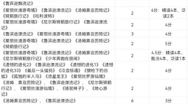 下表中,第一列是读的书的名称,第二列是写了几篇读书笔记,第三列是家长评分。