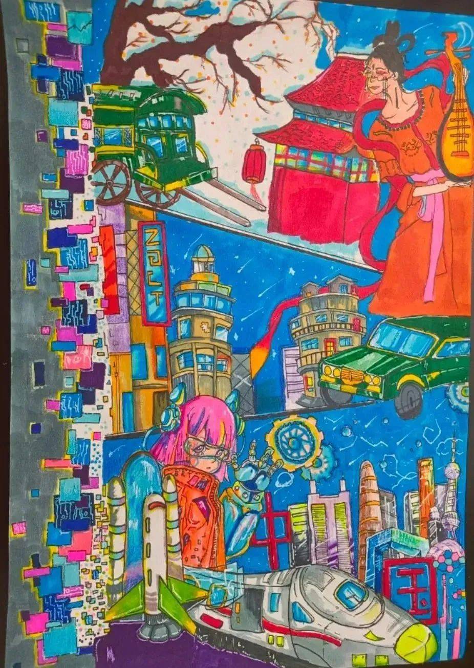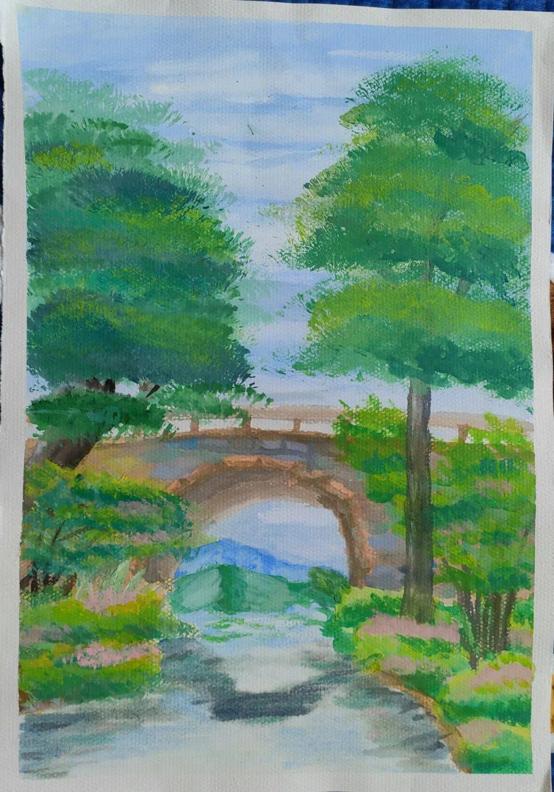 “我画的是我魂牵梦萦的家乡,这是我童年的回忆。家乡有一座石桥,桥下的河水清澈见底,河的两边都是高大的树,夏天这里简直是小伙伴们的天堂。回到童年是我的梦想,无法实现却无比美好的梦想。”