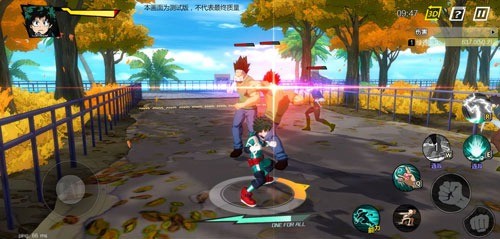 游戏中采用了第三人称的战斗方式,整体操作也采用了较为主流的左摇杆控制移动,右边虚拟按键控制攻击和技能。试玩时提供的绿谷出久和爆豪胜己两个角色在操作和特效上就能感受到性格的差别,也是对原IP的还原。