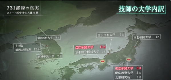 根据研究资料,至少有10所大学以及研究机构,向731部队派出了约40余名研究人员,这些顶尖的医学专家在731部队中处于最核心的地位,主导了人体实验研究工作。