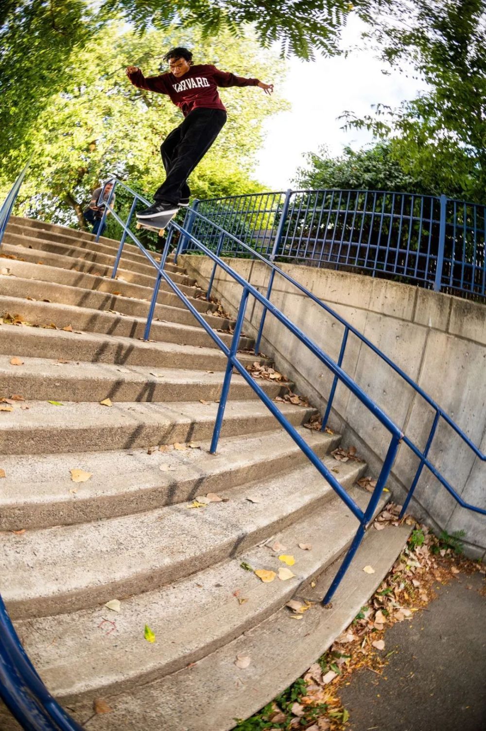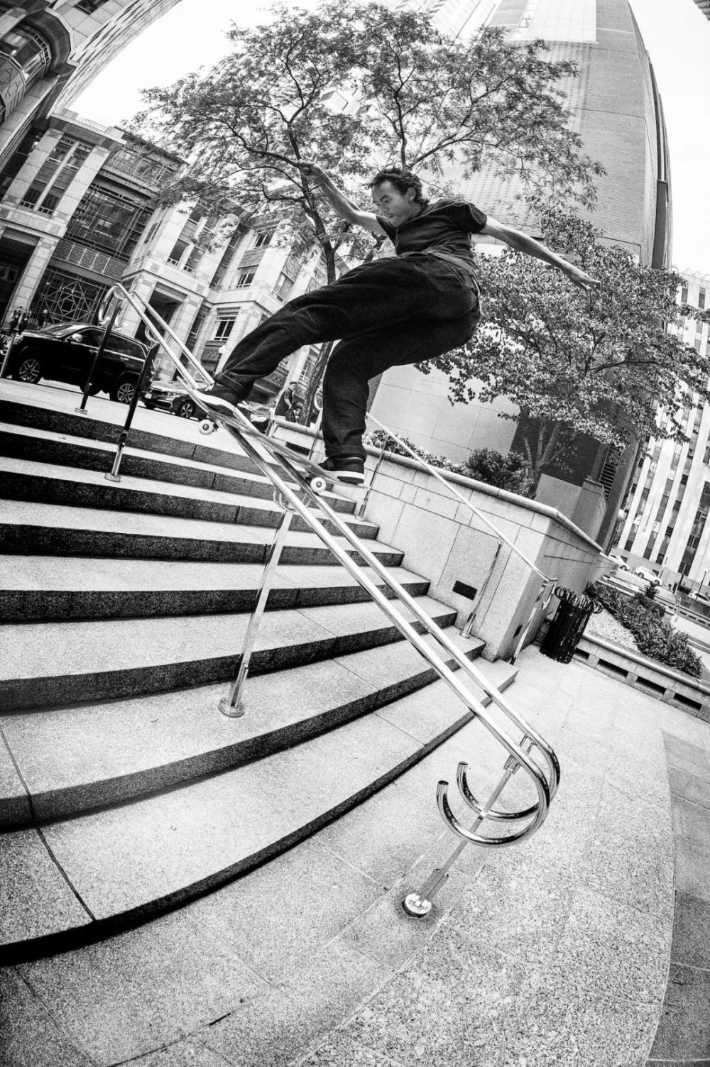 他很安静,但如果你开始和他说话,继续话题的话,他就会和你聊天。Nick很矜持,但和他聊天和一起玩真的很酷。他实际上是GOAT。当我们在城里的时候,他只是快速地拿下那些地形。他的滑板技术让人印象深刻,他处理事情的方式让人觉得,他要么真的喜欢一个地方,并且下定决心,要么他就会安静下来,直到我们到达他喜欢的地方。他知道他想滑什么,他知道他的招,他很挑剔。如果他喜欢一个地形,他会拿下它的。