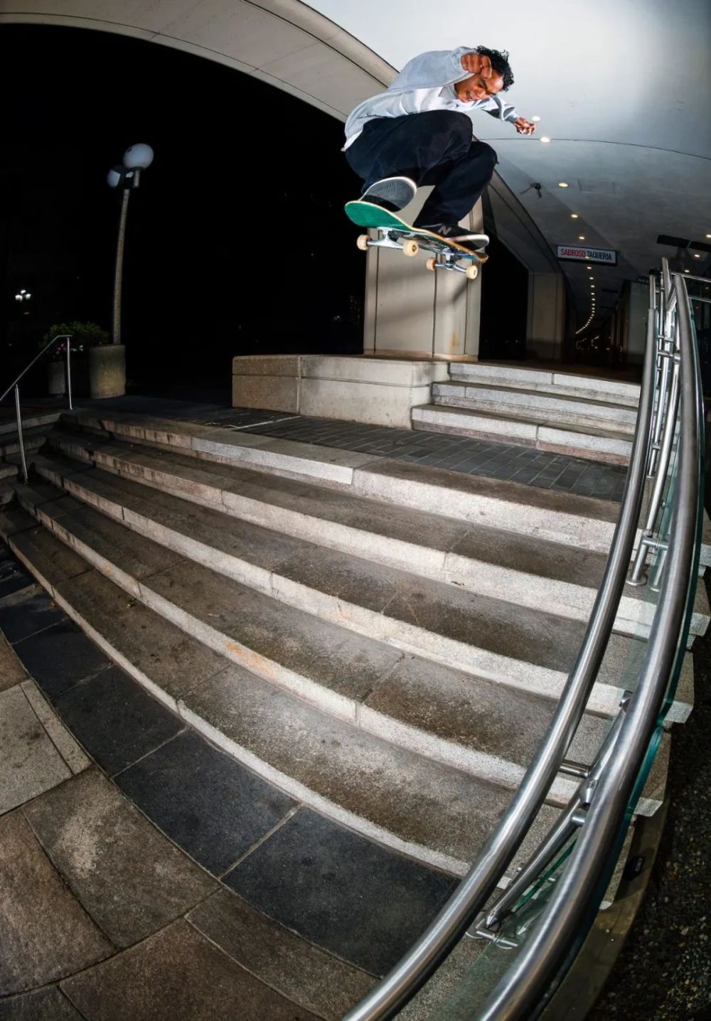 我想那是在城市里的一天,也许是旅行的第一天,我们去了四个地方,他在那些地方用back to back做招,比如在有消防栓的两个楼梯上做了Nollie front heel,在那个没有上蜡的地形做了switch back 180 nosegrind。我当时就想,哥们儿!你怎么这么有信心?滑板时充满自信,而且做招的选择也是如此独特。当我看他滑板时,我很敬畏,这让你觉得,这家伙是个城市滑手。