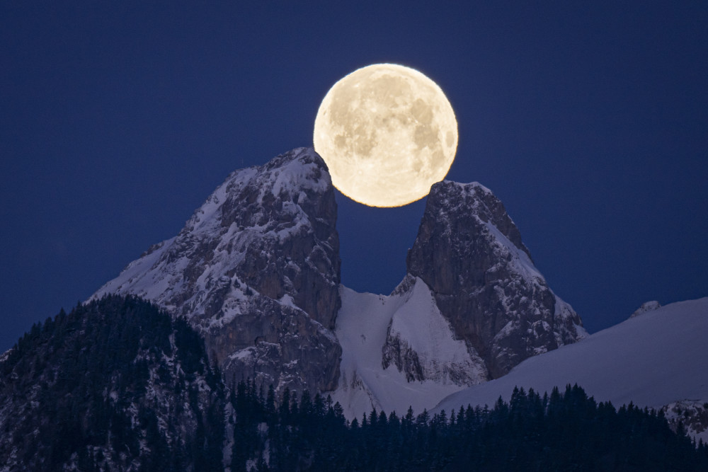 这是2月6日在瑞士阿尔卑斯山拍摄的瑞梅勒双峰和满月。新华社/欧新