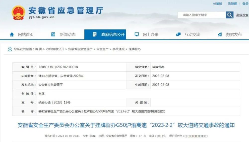 2月8日,安徽省应急管理厅网站发布消息,根据《较大事故查处挂牌督办办法》(皖安〔2010〕10号)规定,安徽省安全生产委员会办公室决定对铜陵市“2023·2·2”较大道路交通事故查处实行挂牌督办。
