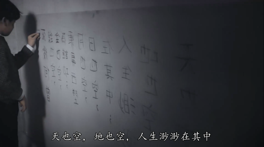 全剧一开篇,一个男孩一边朗诵《万空歌》,一边在走廊墙壁上写字,街头拉近,墙上的自序、写字的手,都与现实世界相反,成镜像颠倒。