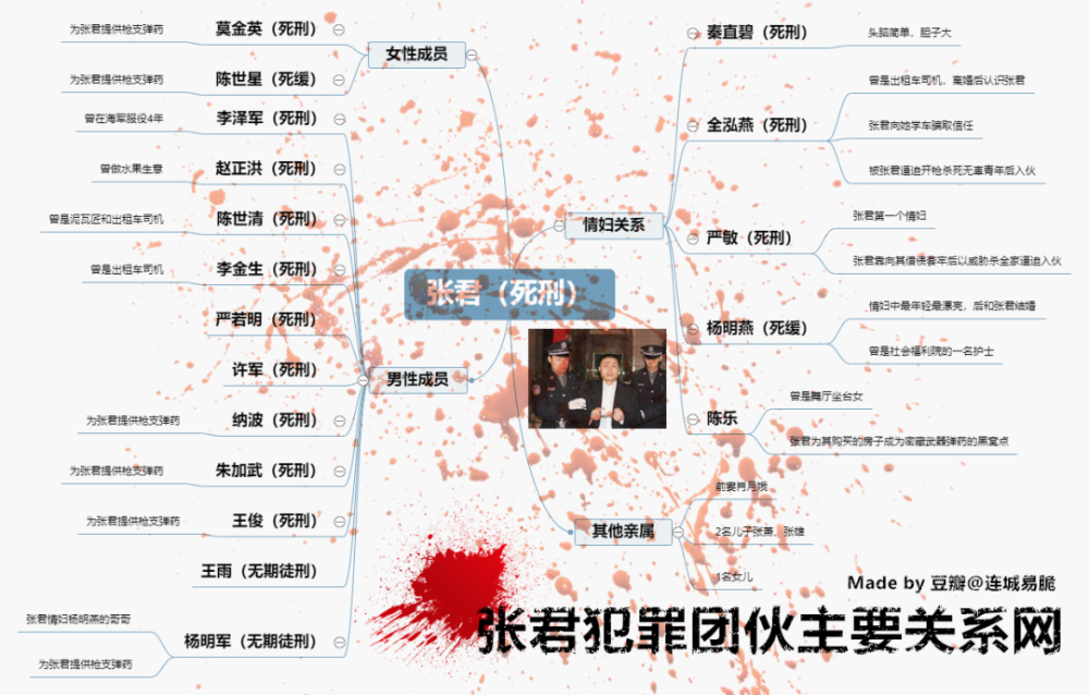 我根据各方资料整理出了悍匪张君犯罪团伙主要关系网,人数之多同样让人咋舌。
