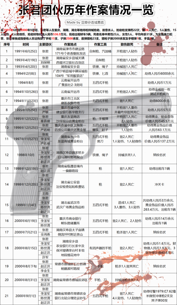 下方为我根据具体卷宗整理出来的张君团伙历年杀人抢劫的具体情况一览表。