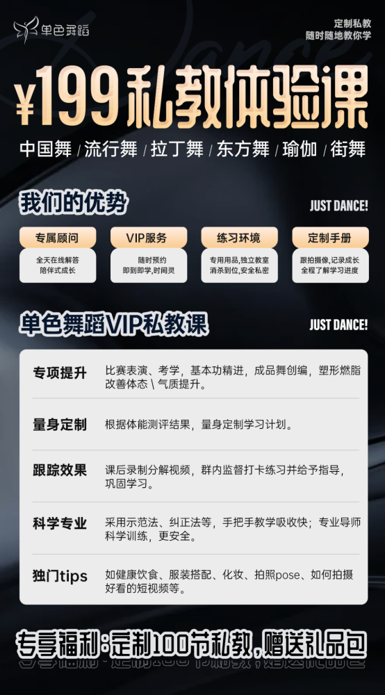 目前199元私教体验课活动限时开放中!如果你最近考虑学习舞蹈私教课,不妨先从私教体验课开始,更深入地感受舞蹈私教吧!