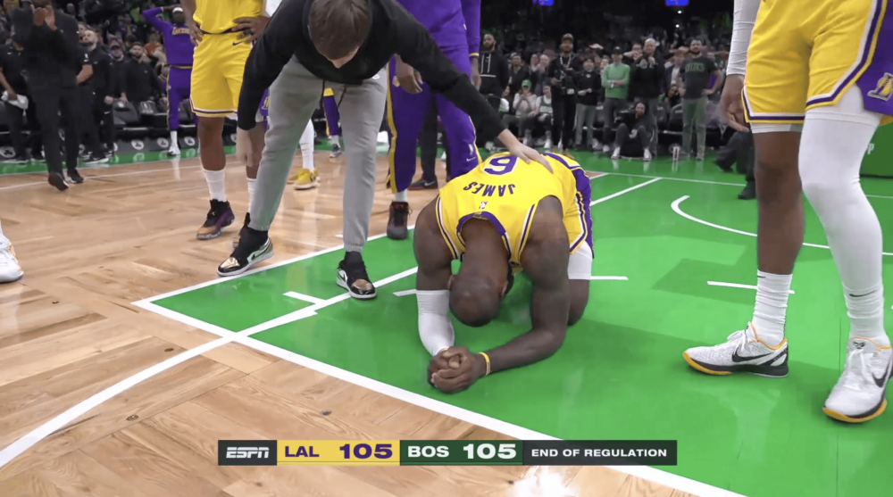 如此严重的误判,也直接让詹姆斯破防了,詹姆斯在向裁判强烈抗议无果后,直接跪在了油漆区附近来表达自己的失望与不满。而与詹姆斯的失望情绪形成鲜明对比的则是塔图姆高举单臂,冲向后场进行庆祝。说真的,作为NBA顶尖的运动员,塔图姆不可能没感觉到自己打手了,这种情况下,裁判漏吹了,就当成神之一手,自己偷着乐就行了。塔图姆大张旗鼓的庆祝行为,多少有些脸皮太厚了。
