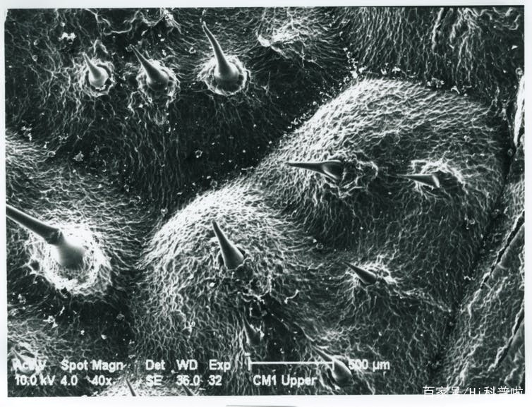 除了物理伤害,毛刺还会对人体进行化学攻击。植物学家还不确定毛刺里的毒素成分具体是什么,但在毛刺中发现了二氧化硅、碳酸钙和磷酸钙。毛刺里的毒素稳定且耐热,可以在几十年内维持性状,100多年前收集的金皮树标本上的毛刺,依然能够让人感受到刺痛感。