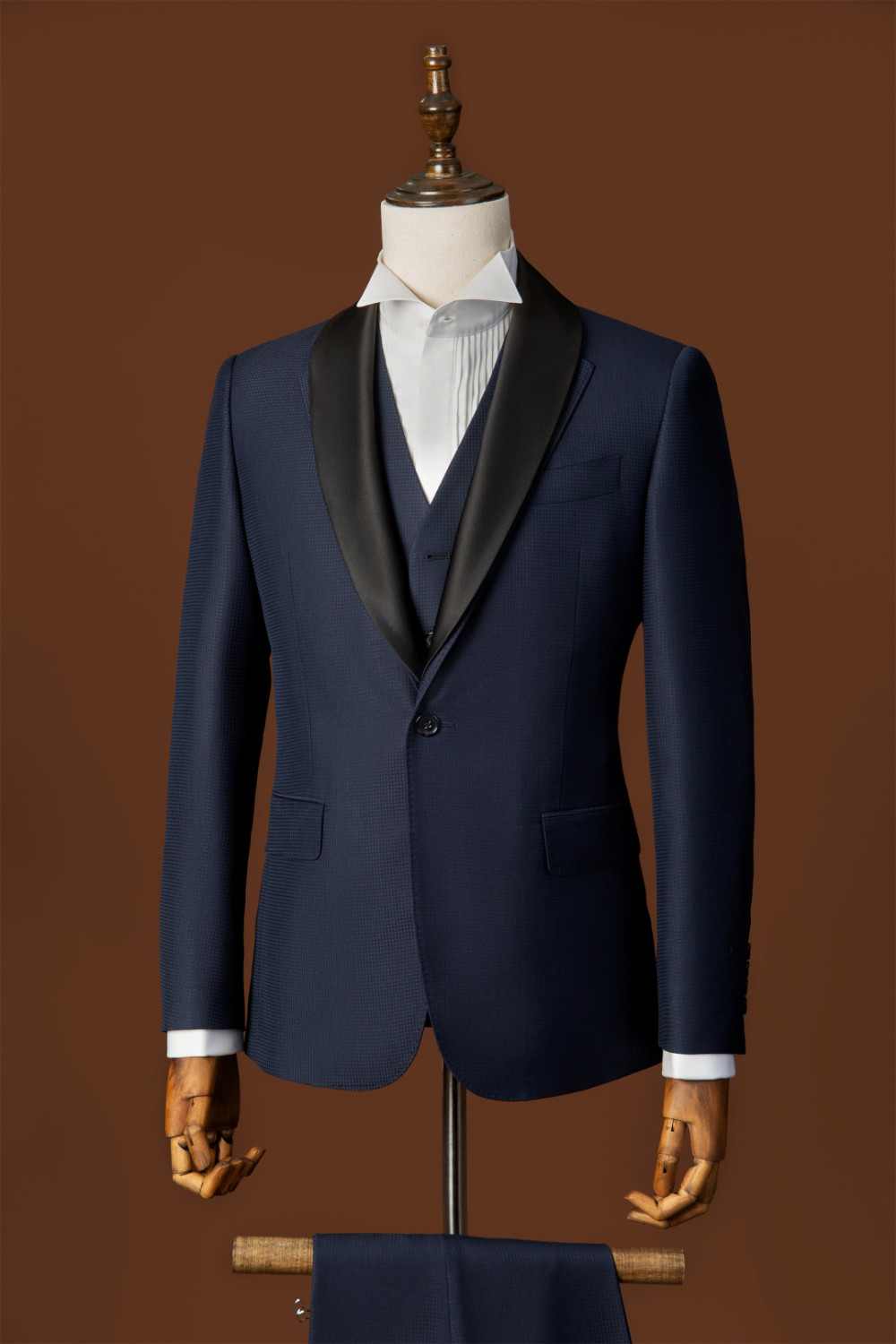 论优雅绅士的适配性,藏蓝色礼服必须拥有姓名。面料质感柔韧细腻,淡淡的花纹,神秘又耀眼。搭配同色马甲和翼领衬衫,简约大方,适合迎亲时穿着。