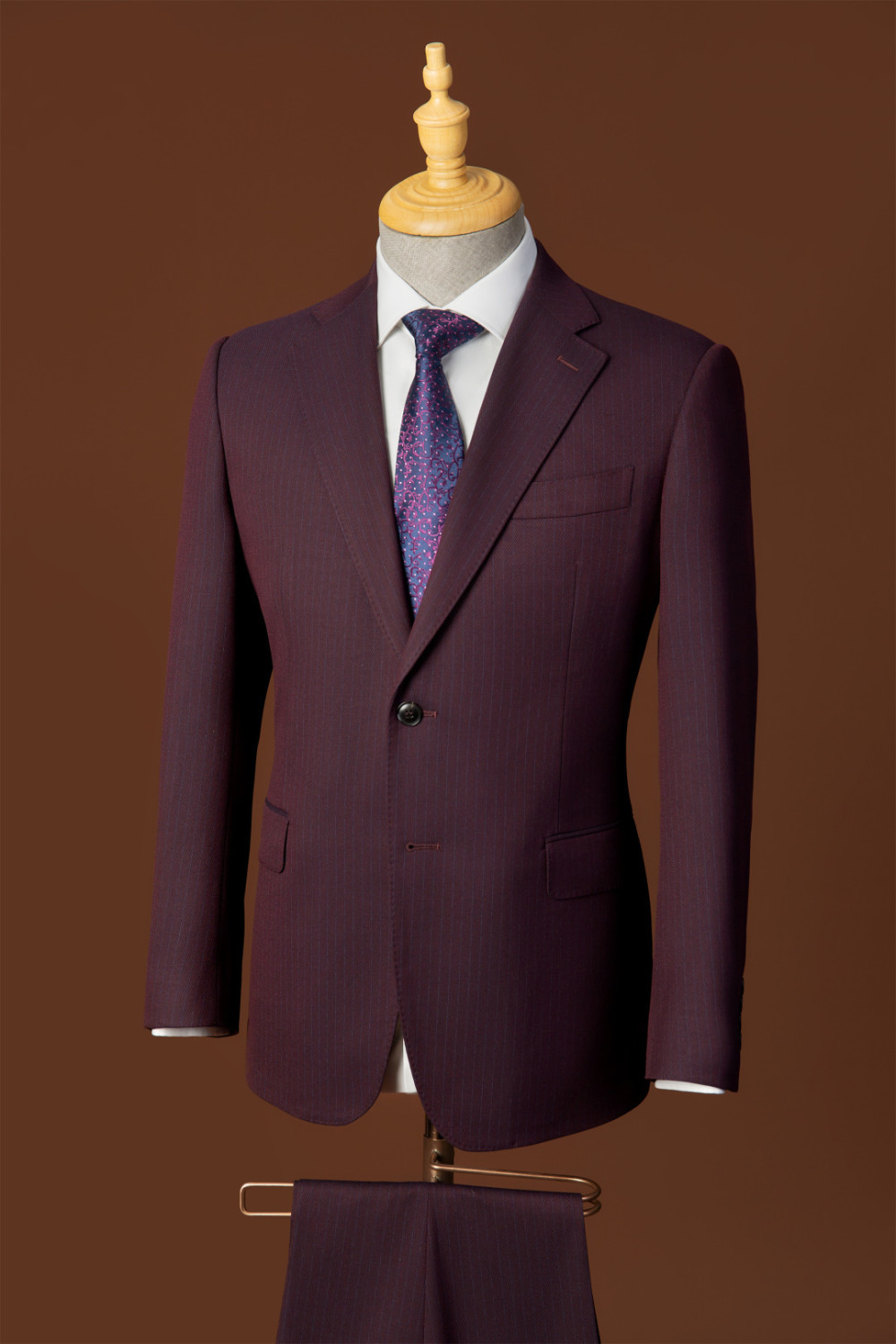 桃花灼灼流光溢彩,酒红色西装配上蓝条纹,纹理清晰,平驳领简单大方,不论是清新的户外婚礼还是典雅的酒店婚礼都能驾驭。