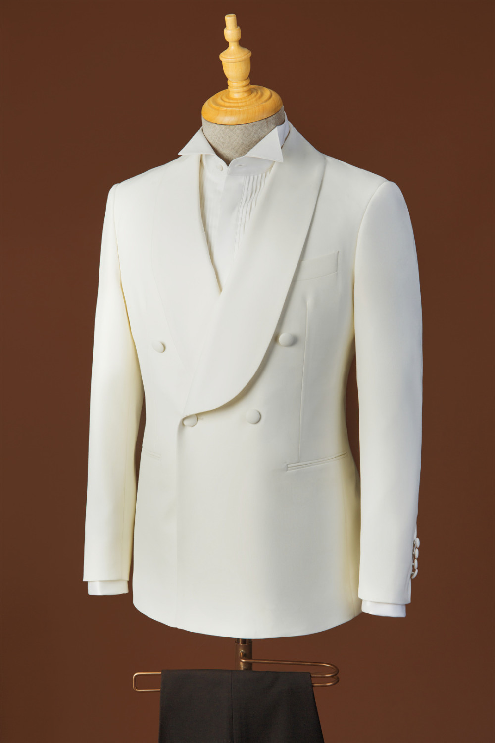 如十里春风带来新意,纯白双排扣礼服,配合青果领圆润的弧度和线条,削弱了原本礼服带来强烈的气场和冲击性,平缓的曲线看起来更加精致优雅,比起戗驳领来说多了一份儒雅浪漫。非常适合春夏季节的户外典礼。
