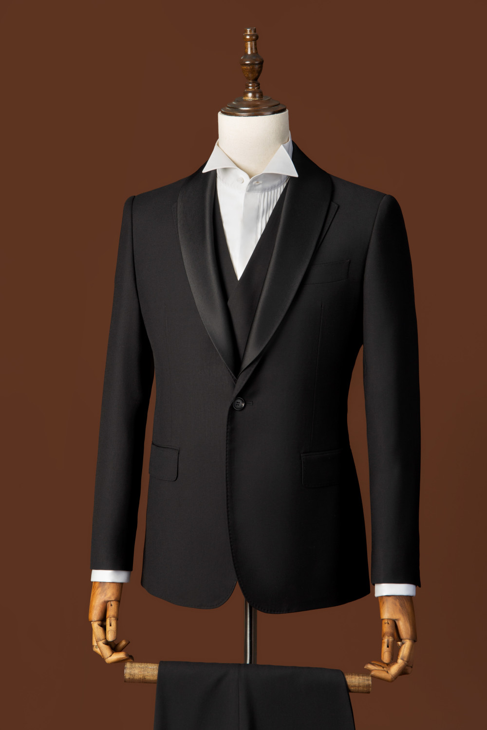 翼领衬衫作为塔士多礼服的标准搭配,胸前的风琴褶样式显得更为挺拔利落,细节上高贵满满。