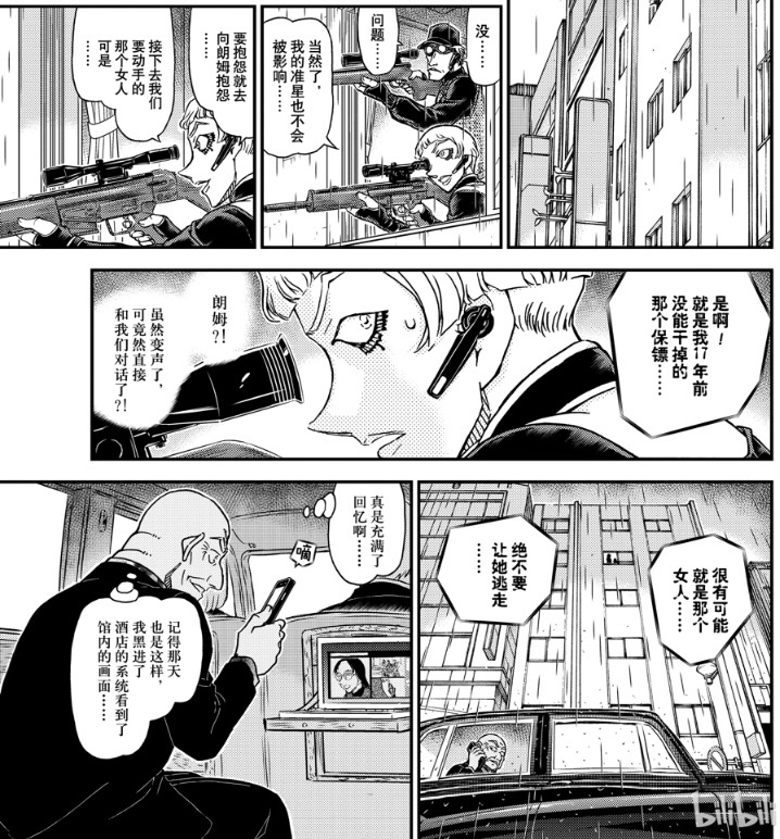 5. 酒店外,科恩与基安蒂准备狙击若狭。朗姆变声后直接对二人传话,认为若狭很可能是十七年前没能解决掉的保镖;