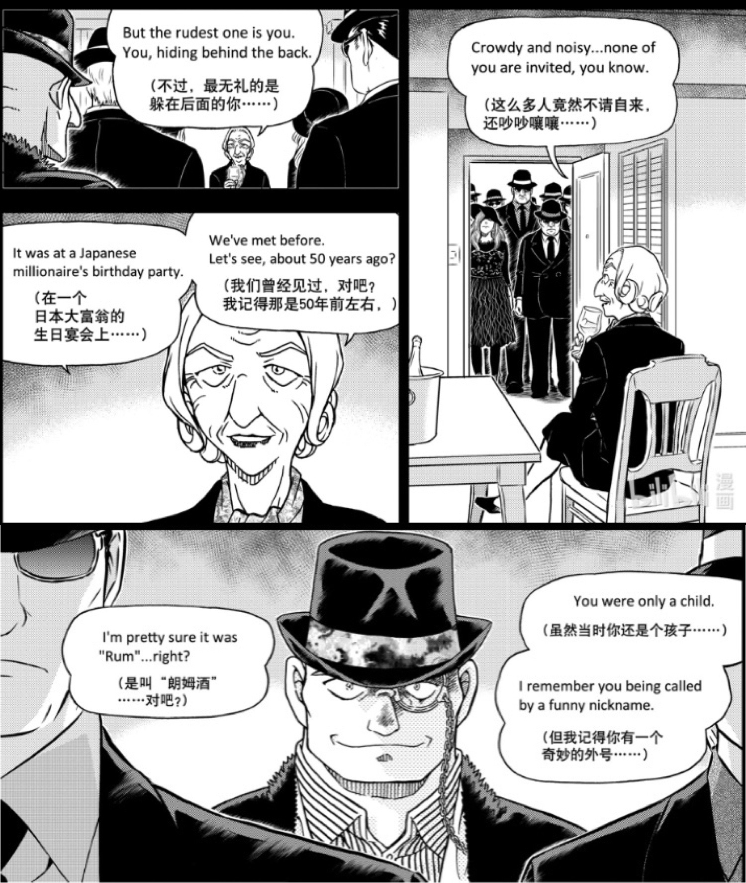 8. 阿曼达在房间独自面对来袭的黑衣人。她对朗姆提到50年前左右(即柯南元年67年前左右)曾在某个日本富豪的生日会上见过还是孩子的他,还听到他的有个绰号“朗姆”(然而胁田初登场时人物介绍栏为56岁,服用药物or青山处理失误or谎报年龄?);
